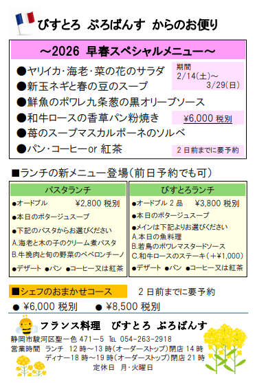 過去のお知らせ串焼・やき鳥を終了させていただきました。 ■定休日変更のお知らせ ■「県のふじのくに安心・安全の店」として認証をして頂きました。 ■シェフのラスクについてお知らせ ■シェフのラスクの価格変更について■